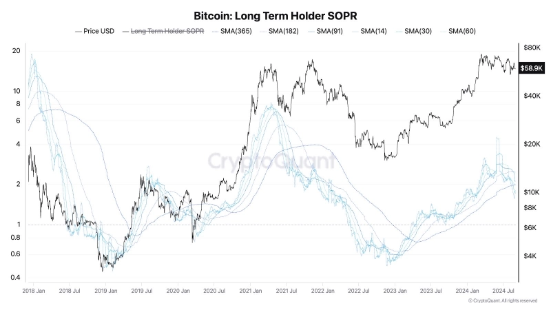 - 비트코인 장기 보유자의 SOPR 지표가 7월 말 이후 지속적으로 하락세를 보이고 있다고 전했다.