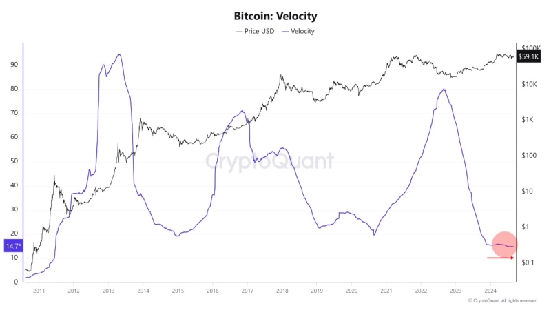 지난달 31일(현지시간) 크립토퀀트 저자 맥디(MAC_D)는 "과거 사이클을 보면 본격적인 상승랠리 전 비트코인 유통속도가 증가하는 모습을 보였다. 그러나 최근 유통 속도는 별다른 변화를 보이지 않고 있다"고 전했다.