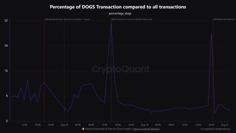 2일(현지시간) 크립토퀀트 저자 maartunn는 "톤 기반 밈코인 도그스는 텔레그램 창업자 파벨 두로프의 반려견을 마스코트로 만든 코인인데, 최근 두로프의 체포 및 에어드랍 이벤트로 크게 주목받았다"고 전했다.