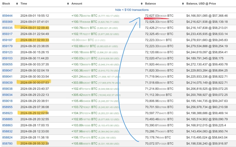 '미스터 100'으로 알려진 고래가 전날 비트코인(BTC)을 추가로 매수했다.