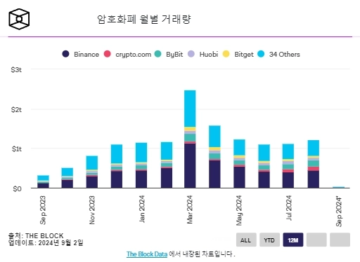 2일(현지시간) 더블록 보도에 따르면 8월 중앙화 거래소 거래량은 1조2000억달러로, 지난 7월 기록한 1조1200달러보다 6.6% 증가했다.