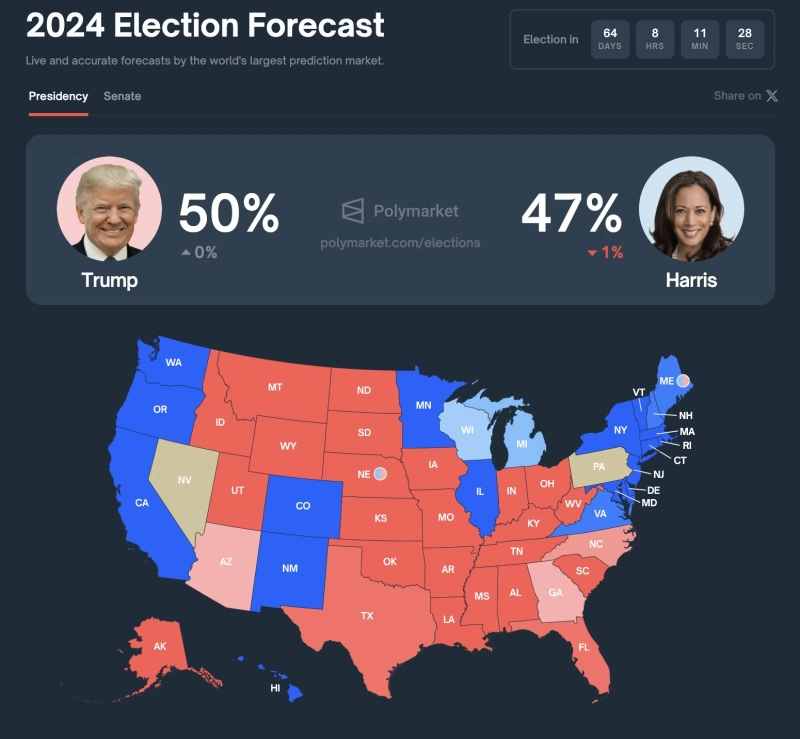 - 폴리마켓에서 도널드 트럼프의 당선 확률이 50%로 상승했다고 밝혔다.