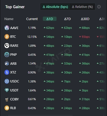 1위는 디파이 프로토콜 에이브가 차지했다. 에이브는 이날 도널드 트럼프 미국 공화당 대통령 후보의 가상자산 프로젝트 월드 리버티 파이낸셜에 연관되면서 1위에 오른 것으로 풀이된다. 일부 공개된 백서에 따르면 월드 리버티 파이낸셜에는 에이브 및 이더리움 블록체인 기반 신용계좌 시스템이 포함됐다.