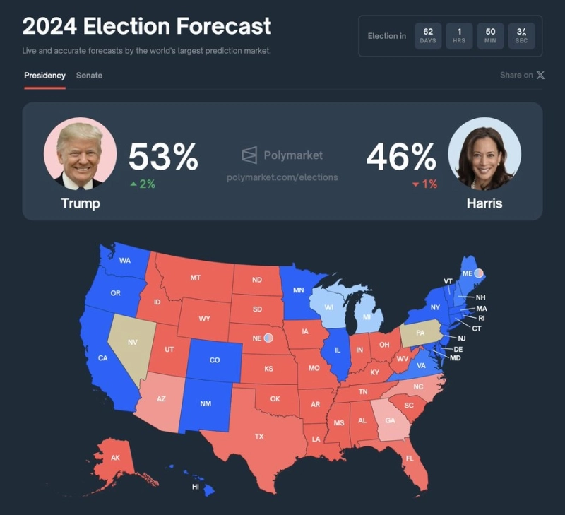 폴리마켓에서 도널드 트럼프 당선 확률이 상승해 카멀라 해리스와 격차를 벌리고 있는 것으로 나타났다.