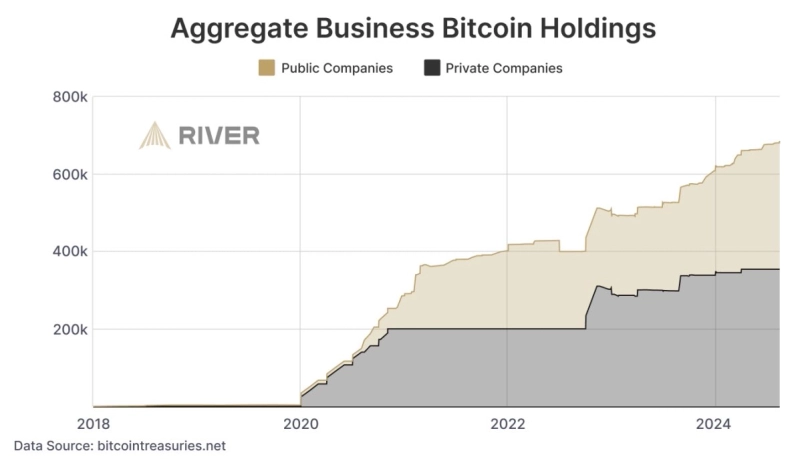 4일(현지시각) 코인텔레그래프는 리버의 보고서를 인용해 "현재 공개 기업들이 68만3000BTC를 보유하고 있다"라며 "이는 2020년 이후로 587% 증가한 수치"라고 밝혔다. 이어서 "마이크로스트래티지, 테더, 비트멕스, 블록원, 자포가 보유한 비트코인이 전체 기업 보유량의 82%를 차지한다고 덧붙였다.