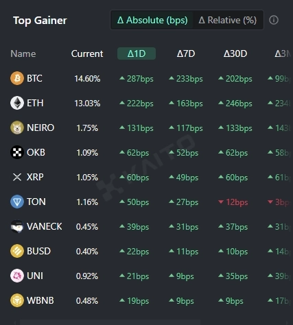 인공지능(AI)기반 웹3 서치 플랫폼 카이토(Kaito)의 토큰 마인드셰어(Token Mindshare, 가상자산 시장 내 특정 토큰의 영향력을 정량화한 지표) 탑게이너에 따르면 7일 현재 사람들이 가장 많이 관심을 보이고 있는 가상자산(암호화폐) 상위 5개는 비트코인(BTC), 이더리움(ETH), 네이로(NEIRO), OKB(OKB), 리플(XRP) 등이다.