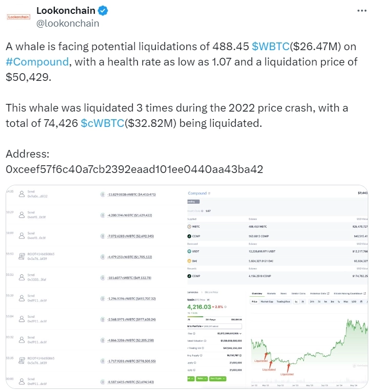 7일(현지시간) 룩온체인이 X(구 트위터)를 통해 "현재 특정 고래가 컴파운드에서 488.45WBTC(약 2647만달러) 청산에 직면해 있다"고 전했다.