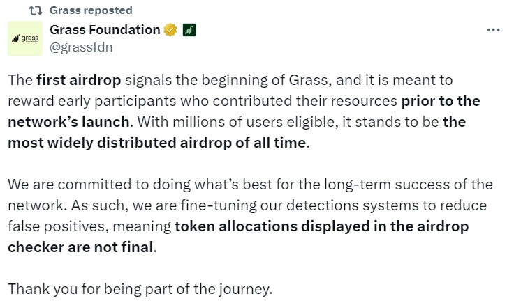 탈중앙화 인공지능(AI) 네트워크 그래스(Grass) 측이 7일(현지시간) X(구 트위터)를 통해 "우리는 네트워크의 장기적 성공을 위해 최선을 다하고 있으며, 이를 위해 시스템을 일부 조정 중이다"라며 "에어드롭 확인 도구에 표시된 토큰 할당이 최종 개수가 아니다"고 전했다.