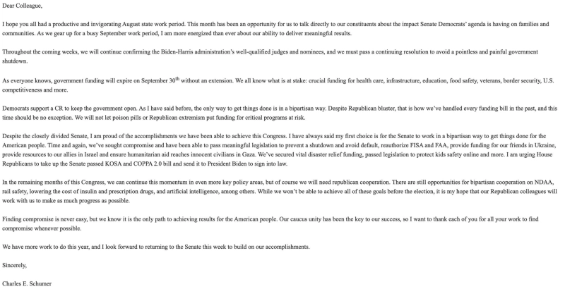 - 슈머 원내대표가 동료 의원들에게 보낸 서한에서 인공지능(AI)은 포함됐으며, 가상자산은 제외됐다고 밝혔다.