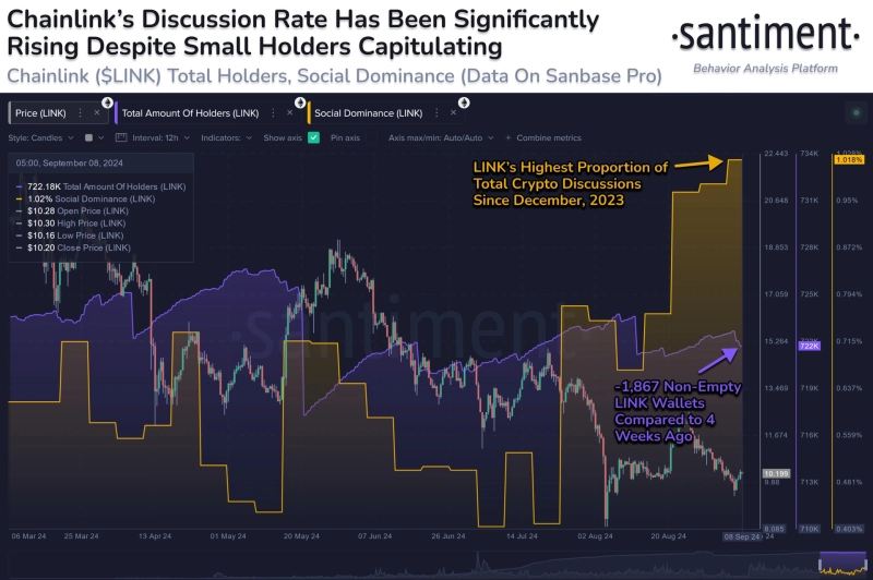 - 체인링크의 소셜미디어 언급량이 2024년 최고 수준에 도달했다는 샌티먼트의 분석이 전해졌다.