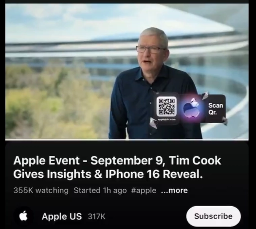 9일(현지시간) 코인텔레그래프에 따르면 이날 유튜브에서는 예정됐던 애플의 신제품 발표회에 맞춰 팀 쿡 애플 최고경영자(CEO)를 딥페이크 한 영상이 쏟아졌다. 애플 공식 유튜브에서 '글로우 타임(It's glowtime)' 라이브가 진행되는 동안 타 채널에서도 팀 쿡 CEO가 등장했다.