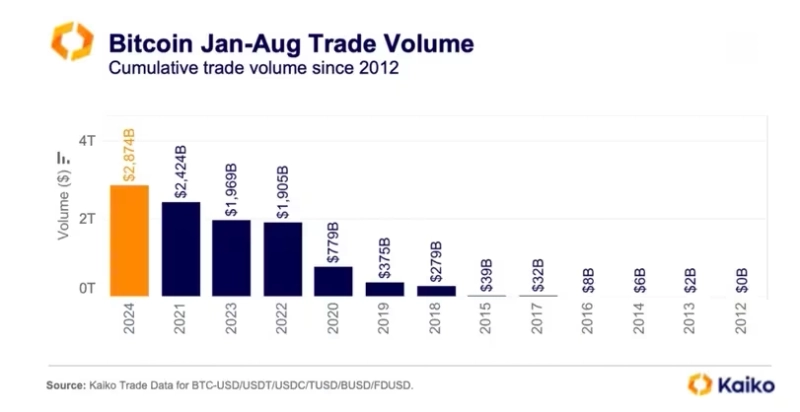 10일(현지시간) 가상자산(암호화폐) 전문 미디어 코인데스크는 온체인 분석 플랫폼 카이코 데이터를 인용해 "올해 1월부터 8월까지 8개월 간 누적 거래량은 2조8740억달러로, 2021년 강세장에 기록한 2조4240억을 약 20% 넘어섰다"라고 전했다.