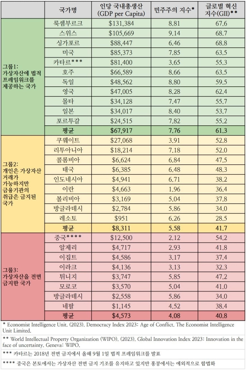 법적 프레임워크를 갖춘 그룹1 국가들의 평균 1인당 GDP는 6만7917 달러로, 가상자산을 전면 금지한 그룹3 국가들의 4619달러나 금융기관만 금지한 그룹2 국가들의 8311달러와 비교해 현저히 높다. 민주주의 지수에서도 그룹1 국가들은 평균 7.76점으로, 다른 두 그룹(4.08점, 5.58점)을 크게 상회한다. 글로벌 혁신 지수(GII)에서도 그룹1 국가들은 평균 61.26점으로, 다른 그룹들(40.79점, 41.72점)을 큰 격차로 앞서고 있다.