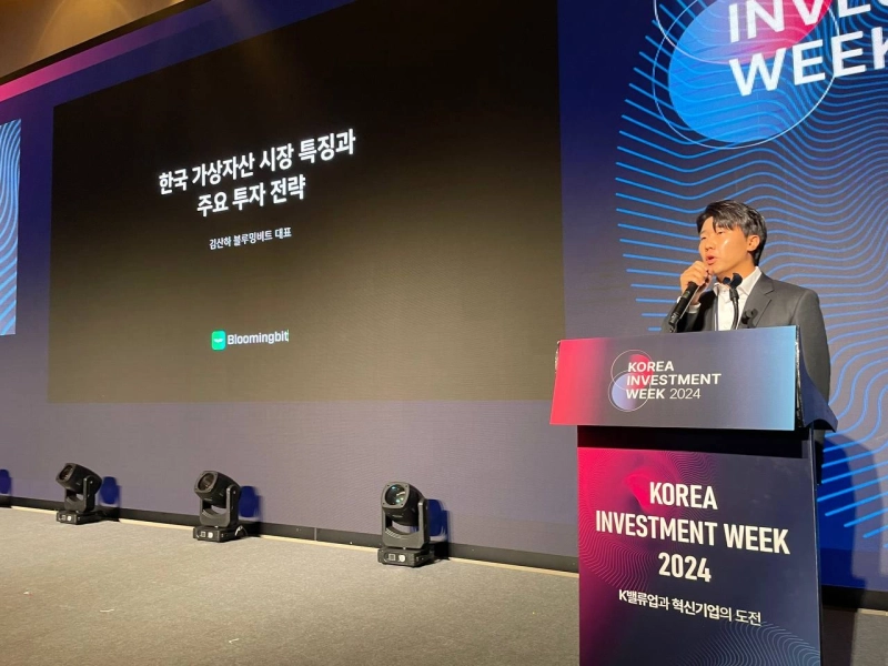 12일(현지시간) 김산하 대표는 여의도 콘래드 그랜드볼룸에서 개최된 코리아인베스트먼트위크(KIW 2024) 블루밍비트 컨퍼런스에서 '한국 가상자산 시장 특징과 주요 투자 전략'에 대해 발표했다.