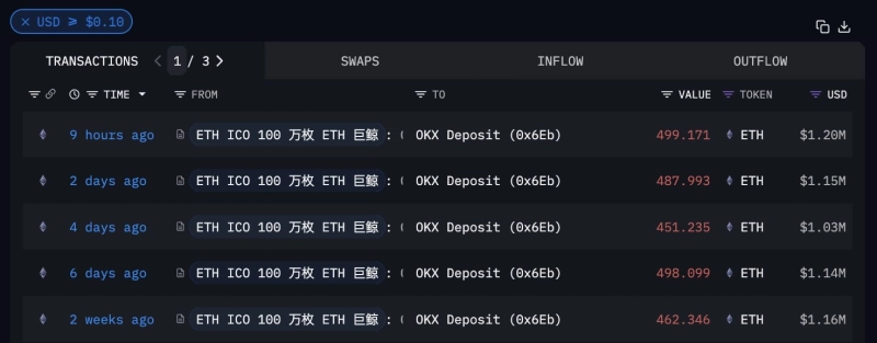 이더리움(ETH) ICO 참여 고래가 오늘 새벽 120만달러 상당의 이더리움을 OKX로 입금한 것으로 나타났다.