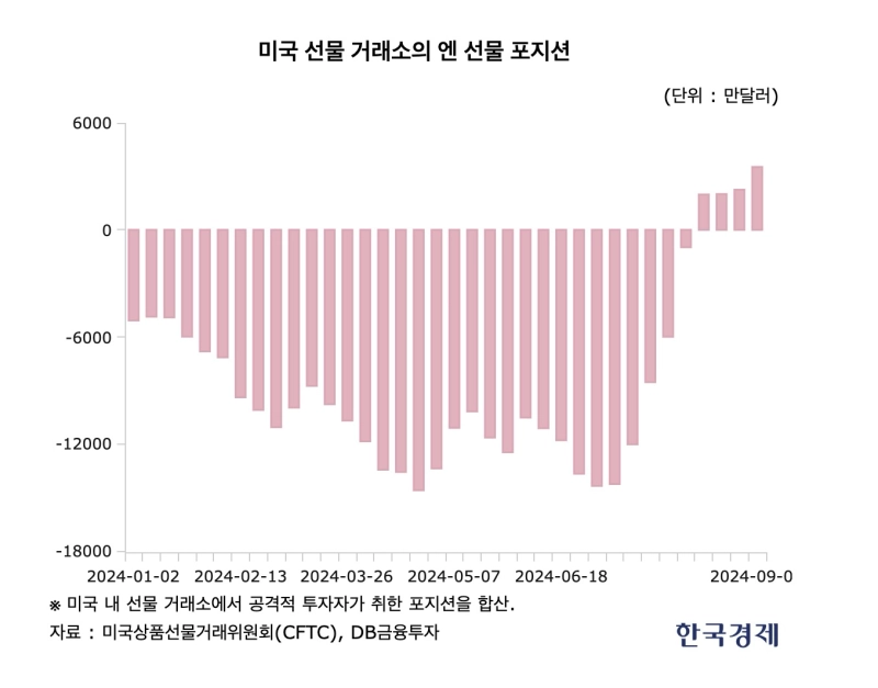 문 팀장은 "지난달 글로벌 증시 폭락 당시 미국 내 선물 거래소에 설정돼 있던 엔 선물 쇼트 포지션이 70% 이상 청산됐다"며 "최근에는 오히려 매수 포지션이 더 많은 상황이 이어지고 있다"고 했습니다. 실제로 미국 상품선물거래위원회(CFTC) 데이터를 보면 엔화 선물에 대한 순 포지션(매수+매도 포지션: 이 값이 플러스면 매수 포지션이 더 많고, 마이너스면 매도 포지션이 더 많다는 걸 의미)은 지난 7월 중순께부터 마이너스 폭을 급격히 줄이기 시작했습니다. 지난 7월 30일 -5억9930만달러였던 이 수치는 폭락 직후인 지난달 6일 -9750만달러가 됐습니다. 그 다음 주인 지난달 13일에는 +1억9800만달러로 매수 포지션 우위의 상황이 됐고, 이후에도 이런 흐름이 이어지고 있습니다.