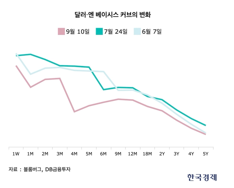 당시 증시 폭락의 원인이 엔 캐리 트레이드 청산이 아니라는 근거는 이 외에도 있습니다. 문 팀장은 "선물환 매도를 통한 환 헤지 움직임을 보여주는 '달러/엔 교차 통화 스와프(XCCY)'가 최근까지도 계속 하락하고 있다"며 "이는 엔 캐리 트레이드를 했던 투자자들이 이 포지션을 청산하지 않고 아직 유지하고 있다는 것을 의미한다"고 했습니다. 아래 그래프를 보면 시간이 지남에 따라 곡선이 아래로 내려온 걸 확인할 수 있습니다. 이는 "최근으로 오면서 엔·달러 환 헤지 비용이 커졌다는 걸 의미한다"는 게 문 팀장의 설명입니다. 엔·달러 환 헤지 수요가 여전히 많기 때문에 이 거래의 비용이 시간이 지남에 따라 더 커지고 있다는 겁니다. 파생상품 시장에서도 수요 공급의 원리에 따라 특정 거래를 하고자 하는 수요가 많으면 그 거래에 드는 비용이 커지거든요.