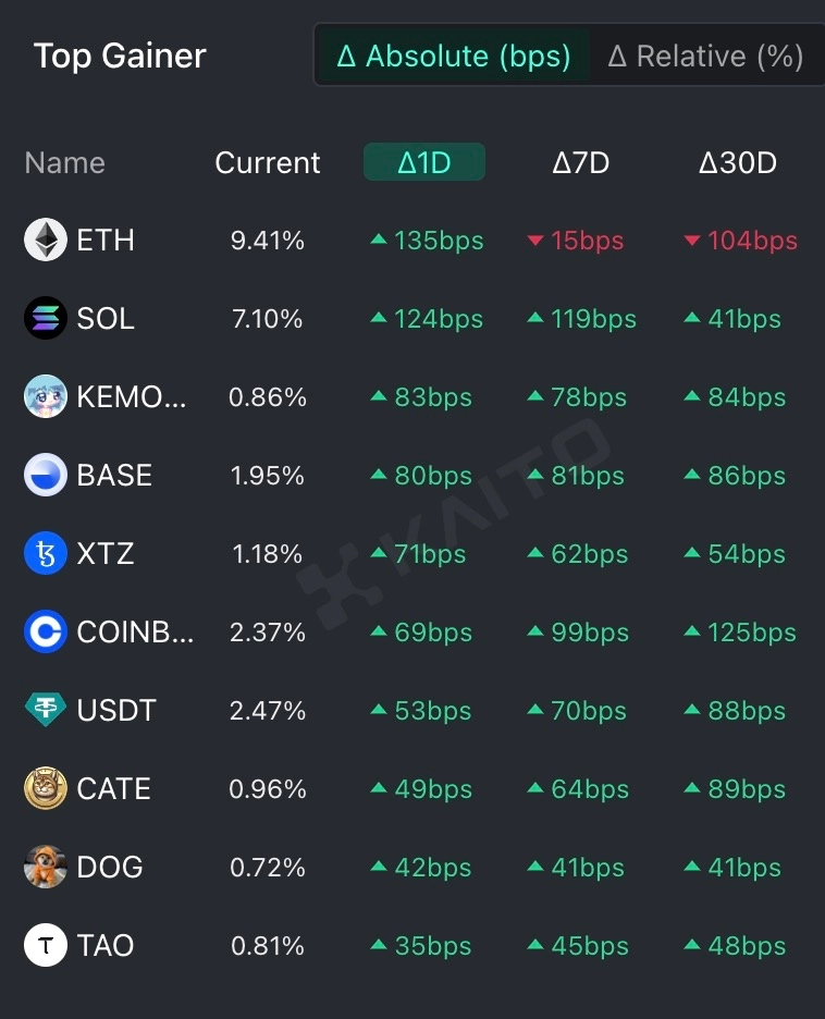 이외에도 투자자들은 테더(USDT), 카체코인(CATE), 독독(DOG), 비트텐서(TAO) 등에 관심을 갖는 것으로 나타났다.