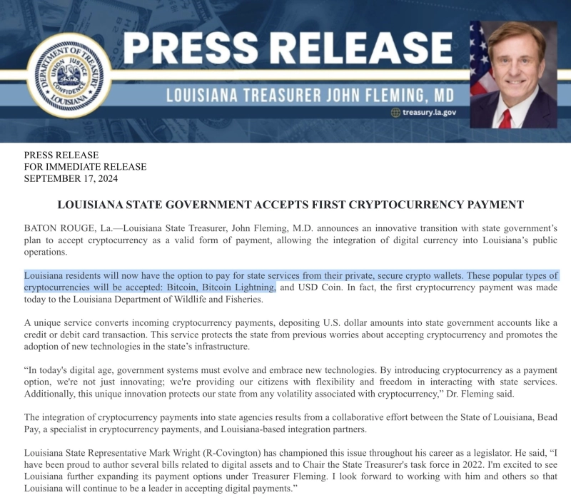존 플레밍 루이지애나주 재무장관은 "루이지애나 야생동물 및 수산부 관련 과태료가 비트코인 라이트닝 네트워크를 통해 처리됐다"라며 "가상자산을 결제 수단으로 도입함으로써 단순한 혁신이 아닌, 시민들에게 더 많은 자유와 유연성을 제공하는 것"이라고 설명했다.