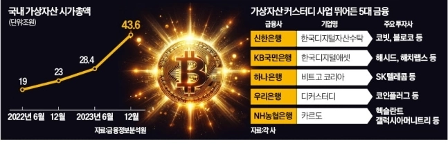 5대 금융이 가상자산 수탁에 관심을 보이는 것은 이 시장의 성장 가능성이 높기 때문이다. 국내 가상자산 시가총액은 지난해 말 기준 43조6000억원이다. 국내에서는 개인 투자만 가능한데 법인 투자가 본격화하면 새로운 먹거리가 창출될 것으로 전망된다. 전 세계 가상자산 시가총액은 현재 2조1400억달러(약 2800조원)다.