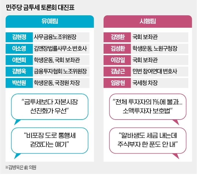 유예팀은 김현정·이소영·이연희·박선원 의원과 김병욱 전 의원이 포함됐다. 팀장인 김현정 의원은 사무금융서비스노조위원장 출신이다. 김 의원은 “금투세 시행은 금융시장에 큰 영향을 미치는 대단히 중요한 사안”이라며 유예론을 폈다. 이소영 의원은 당내에서 가장 먼저 금투세 유예 필요성을 공개적으로 주장한 인물이다. 김앤장법률사무소 변호사 출신으로 자본시장에 대한 이해도가 높다는 평가를 받는다.