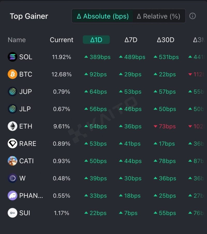 인공지능(AI)기반 웹3 서치 플랫폼 카이토(Kaito)의 토큰 마인드셰어(Token Mindshare, 가상자산 시장 내 특정 토큰의 영향력을 정량화한 지표) 탑게이너에 따르면 21일 현재 사람들이 가장 많이 관심을 보이고 있는 가상자산(암호화폐) 상위 5개는 솔라나(SOL), 비트코인(BTC), 주피터(JUP), 주피터 펄프 LP(JLP), 이더리움(ETH) 등이다.