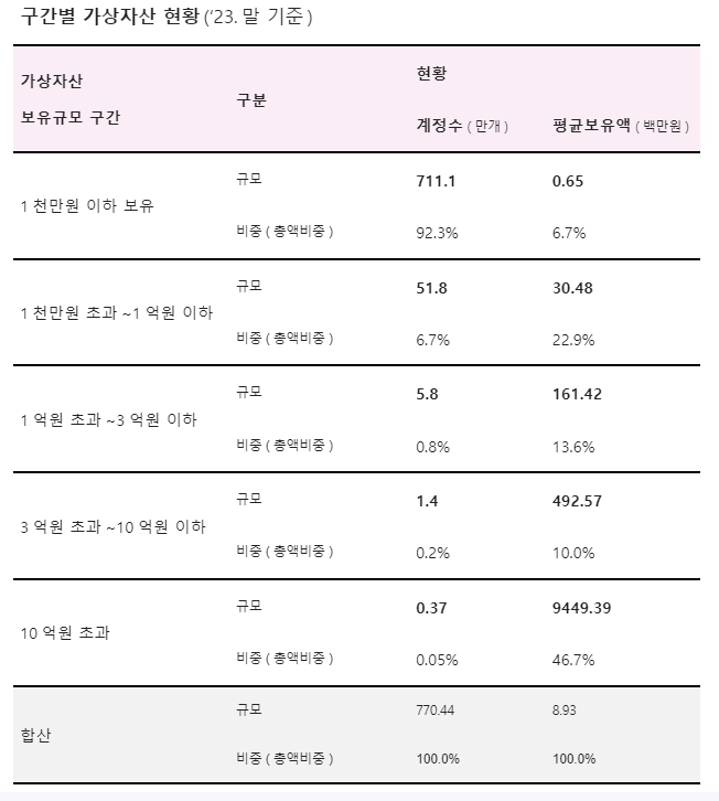 투자 규모별로 살펴보면 1000만원 이하 가상자산을 보유한 계좌수가 전체 92.3%, 10억원이 넘는 초고액 계좌는 3400여개로 0.37%에 해당했다.