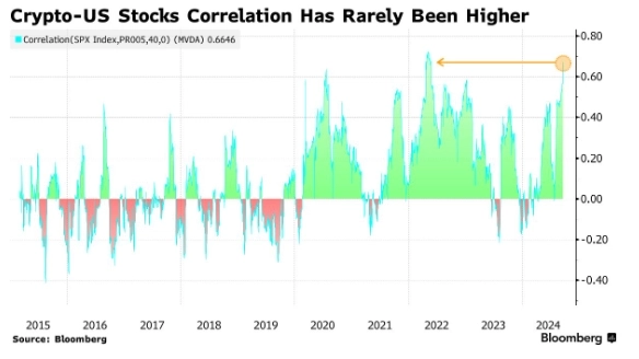 23일(현지시간) 블룸버그는 시총 100위 가상자산과 S&P500 지수의 40일 상관관계는 0.67로, 지난 2022년 2분기(0.72)이후 최대치를 기록했다고 보도했다.