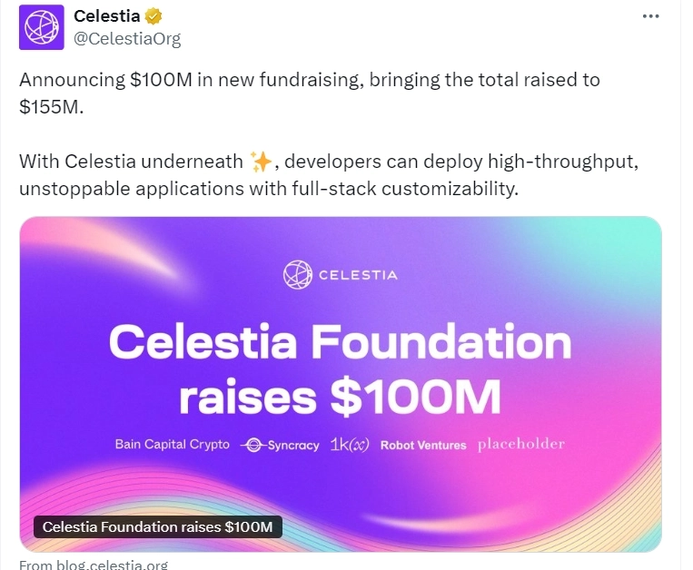 모듈형 블록체인 프로젝트 셀레스티아(TIA) 재단이 23일(현지시간) 공식 X(구 트위터)를 통해 1억달러 규모의 투자를 유치했다고 발표했다.