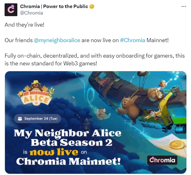레이어1 블록체인 플랫폼 크로미아(CHR)가 24일(현지시간) 공식 X(구 트위터)를 통해 "탈중앙화 온체인 웹3 게임 마이네이버앨리스(My Neighbor Alice, 이하 MNA)가 크로미아 메인넷에서 출시되었다"고 발표했다.