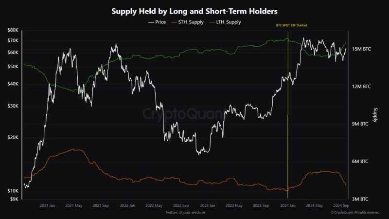 26일 가상자산 분석 플랫폼 크립토퀀트(CryptoQuant)는 X(옛 트위터)를 통해 "올해 비트코인 현물 ETF가 도입된 이후 장기 투자자의 수가 늘어나고 있다"라고 밝혔다. 크립토퀀트는 최근 단기 투자자의 물량은 감소했지만 장기 투자자의 물량은 계속 증가세를 보이고 있다고 부연했다.