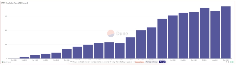 - 9월 에이브의 wBTC 공급량이 3만7000개를 돌파했으며, 이는 현재 시세 기준으로 약 20억 달러에 달하는 규모라고 밝혔다.