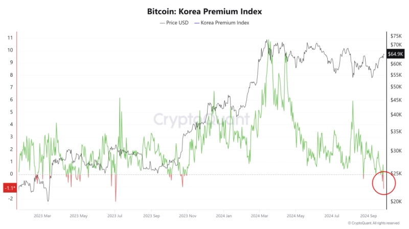 27일 크립토퀀트 기고자 맥디는 보고서를 통해 "최근 한국 프리미엄(김치프리미엄) 지표가 부정적으로 변하고 있다"며 "이는 한국 투자자들이 가상자산 시장에 대한 관심을 잃어가고 있음을 보여준다"고 말했다.