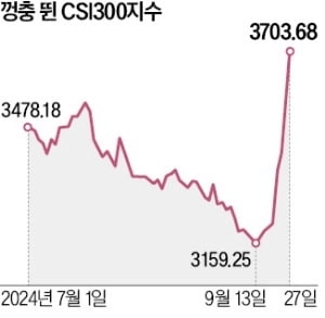 中 '바주카포급' 경기 부양책 통했다…증시 나흘간 12% 껑충27일 상하이종합지수는 전 거래일 대비 2.88% 오른 3,087.53에 장을 마쳤다. 상하이종합지수는 중국 인민은행이 1조위안(약 189조5000억원)의 유동성 공급과 부동산·증시 안정화 대책을 전격 발표한 지난 24일 이후 이날까지 총 12.31% 급등했다. 상하이·선전증시 시가총액 상위 300개 종목으로 구성된 CSI300지수 역시 전일 4.23%에 이어 이날도 4.47% 오른 3,703.68을 나타냈다. 올 6월 초 이후 처음으로 3600선에 올라서며 랠리를 이어가고 있다.