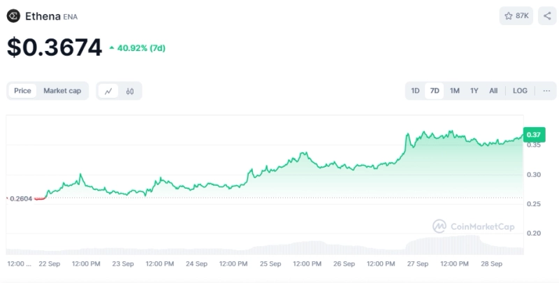 28일 오전 10시 현재 에테나는 코인마켓캡 기준 전일대비 0.90% 하락한 0.3672달러를 기록 중이다. 이날 약보합세를 보이고 있긴 하지만 지난 1주일간 에테나는 40.86% 급등한 상태다.