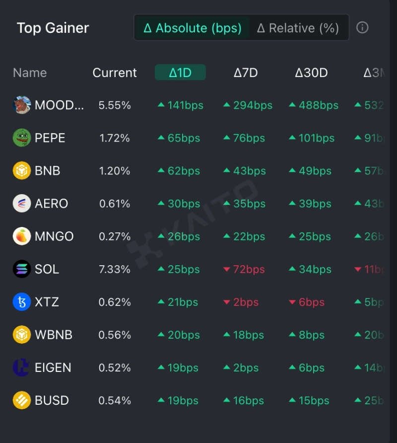 - 인공지능 기반 웹3 서치 플랫폼 카이토(Kaito)의 토큰 마인드셰어 지표에 따르면 밈코인 무뎅과 페페가 최근 상승장에서 눈에 띄는 상승세를 기록 중이라고 전했다.