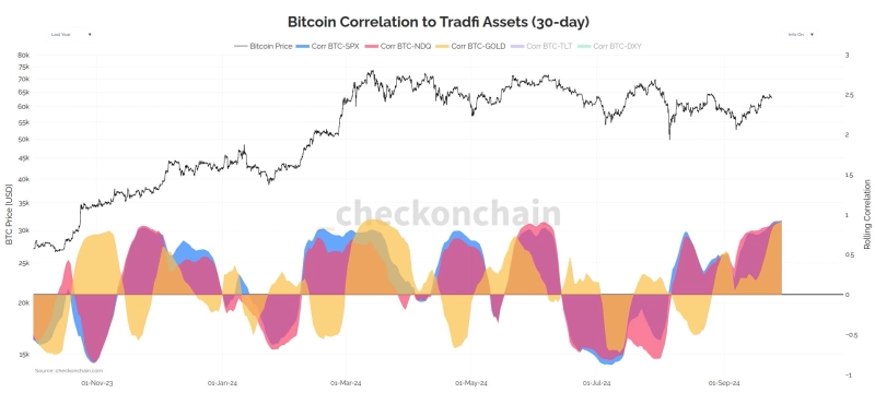 30일(현지시간) 글래스노드의 수석 애널리스트 체크메이트(Checkmate)는 자신의 X(옛 트위터)를 통해 "비트코인은 지난 30일 동안 금, 주식과 높은 상관관계를 보였다"고 전했다.