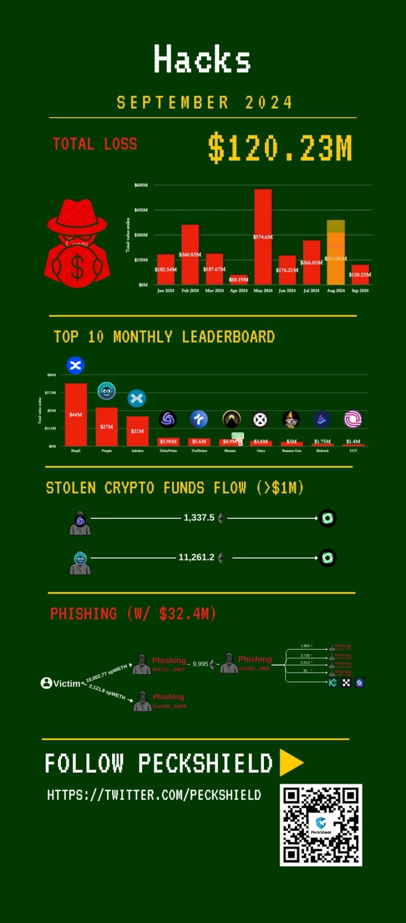 1일(현지시간) 코인텔레그래프는 펙실드 데이터를 인용해 "9월 가상자산 해킹 누적 손실액은 1억2000만달러로, 지난 4월에 이어 월별 손실액 중 두번째로 낮은 수준을 기록했다"라고 전했다.