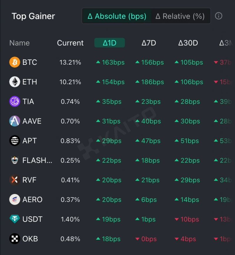 인공지능(AI)기반 웹3 서치 플랫폼 카이토(Kaito)의 토큰 마인드셰어(Token Mindshare, 가상자산 시장 내 특정 토큰의 영향력을 정량화한 지표) 탑게이너에 따르면 4일 현재 사람들이 가장 많이 관심을 보이고 있는 가상자산 상위 5개는 비트코인(BTC), 이더리움(ETH), 셀레스티아(TIA), 에이브(AAVE), 앱토스(APT) 등이다.