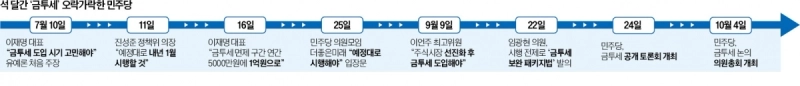 - 국회 다수당인 민주당이 금융투자소득세에 대한 명확한 입장을 정하지 못해, 개인투자자들의 원성과 불확실성이 커지고 있는 상황이라고 전했다.