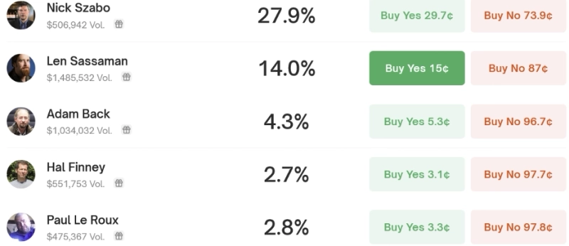 이 가운데 닉 사보가 가장 유력한 인물로 떠오르고 있으며, 현재 폴리마켓에서 27.9%의 가능성을 기록하고 있다. 그 뒤를 렌 사사만(Len Sassaman)이 14%, 애덤 백(Adam Back)이 4.3%의 가능성으로 뒤따르고 있다.