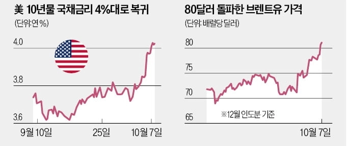 글로벌 금융시장에서 미국 경기 침체 전망이 수그러드는 대신 인플레이션 재발 우려가 커지고 있다. 중동 정세 악화에 따라 브렌트유 선물은 배럴당 80달러를 넘겼고, 국제유가가 물가를 자극할 것이라는 전망에 다음달 미국 중앙은행(Fed)이 기준금리를 동결할 것이란 관측까지 고개를 들고 있다. 미국 고용시장 활황에 국제유가 상승까지 겹치며 10년 만기 미국 국채 수익률은 두 달 만에 연 4%를 넘어섰다.