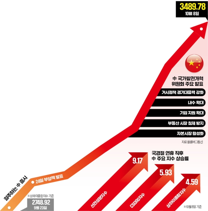 지난달 18일부터 뜀박질한 상하이종합지수는 중국 정부가 대규모 경기부양책을 내놓은 지난달 24일 전 거래일 대비 4.15% 급등한 뒤 연일 상승폭을 키웠다. 주택담보대출 금리 인하와 부동산 규제 완화를 발표한 지난달 30일엔 8.06% 치솟았다. 경기부양책 발표 이후 이날까지 주가 상승폭만 26.95%에 달했다.