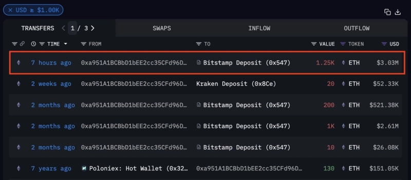 - 특정 주소가 1250ETH를 비트스탬프로 이체한 사실을 온체인 분석 플랫폼이 공개했다고 전했다.