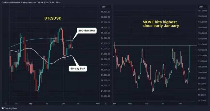 8일(현지시각) 코인데스크는 트레이딩뷰 데이터를 인용해 "미국 국채의 예상 변동성을 나타나는 MOVE 지수는 7일(현지시각) 24% 급증해 최고치를 기록했다"라며 "이는 비트코인 가격에 악영향을 끼칠 수 있다"라고 보도했다. 이어서 "국채의 변동성 증가는 금융 긴축과 위험 회피 심리를 유발한다"라며 "주식, 비트코인과 같은 위험 자산에 가격 부담을 줄 수 있다"라고 설명했다.