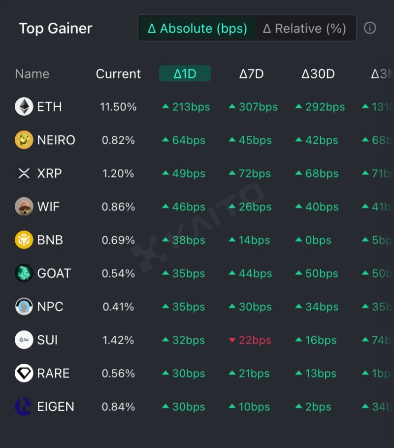 인공지능(AI)기반 웹3 서치 플랫폼 카이토(Kaito)의 토큰 마인드셰어(Token Mindshare, 가상자산 시장 내 특정 토큰의 영향력을 정량화한 지표) 탑게이너에 따르면 12일 현재 사람들이 가장 많이 관심을 보이고 있는 가상자산(암호화폐) 상위 5개는 이더리움(ETH), 네이로(NEIRO), 리플(XRP), 도그위프햇(WIF), 바이낸스코인(BNB) 등이다.
