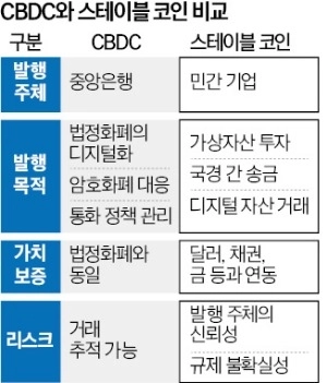 이창용 한국은행 총재가 테더(USDT), 유에스디코인(USDC) 등 달러 연동 스테이블 코인에 대한 규제를 시급히 마련해야 한다고 강조한 것은 스테이블 코인이 한국 금융·외환시장과 통화 정책에 상당한 영향을 미칠 수준으로 부상했기 때문이란 분석이다. 한은은 스테이블 코인 문제에 대응하기 위해 중앙은행디지털화폐(CBDC) 개발에 집중하고 있다. CBDC는 스테이블 코인의 대안이 되기 어렵다는 반박도 나온다.