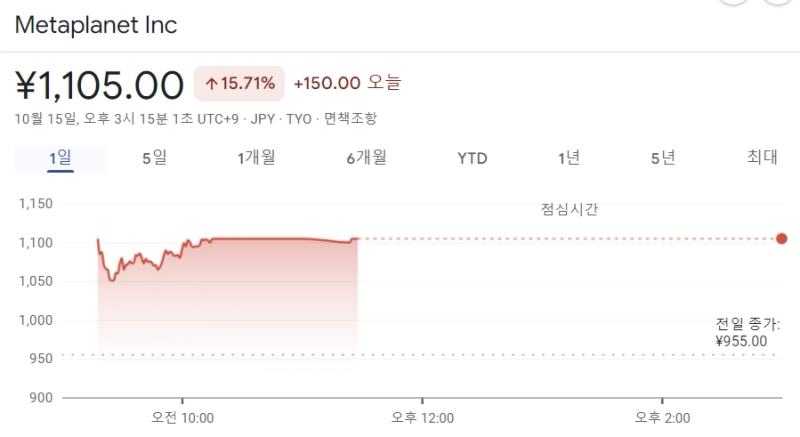 15일 메타플래닛은 도쿄 거래소에서 전일대비 15.71% 급등한 1105엔에 장을 마감했다.