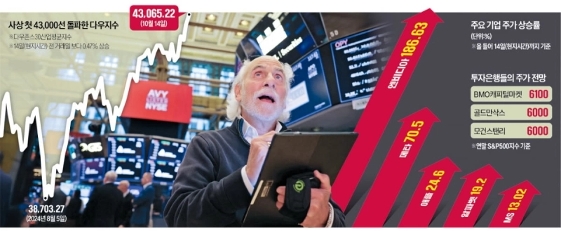 14일(현지시간) 다우존스30산업평균지수는 전 거래일보다 0.47% 상승한 43,065.22에 거래를 마쳐 사상 처음으로 43,000선을 돌파했다. S&P500지수도 0.77% 올라 사상 최고치인 5859.85로 마감했다. S&P500지수는 올 들어서만 45번째 최고치를 경신했다. 기술주 중심의 나스닥지수 역시 0.87% 상승한 18,502.69에 마감했다. 인공지능(AI) 칩 대장주인 엔비디아는 이날 2.43% 오른 138.07달러로 최고치를 새로 쓰며 증시를 견인했다.