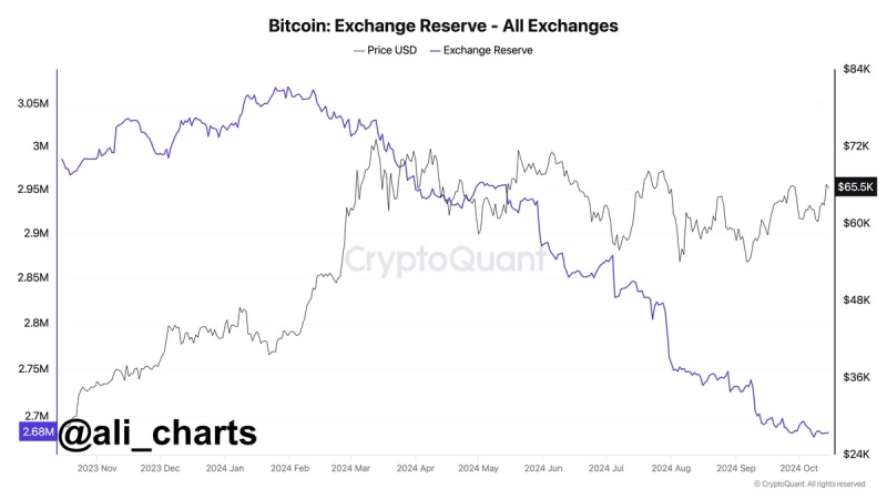 15일(현지시각) 알리 마르티네즈 가상자산(암호화폐) 분석가는 X를 통해 "지난 8개월 동안 40만개 이상의 비트코인이 거래소에서 인출됐다"라며 "이는 약 240억 달러(약 32조7700억원) 규모"라고 밝혔다.